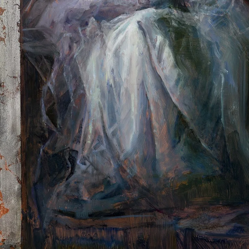 The veil, my chrysalis, teases the viewer with my blossoming form, the brushstrokes embedded with this newfound love. My birdcage, my past sits empty and fades away into a background of dark hues, the birds flock around my head, encouraging my growth to freedom.
